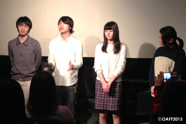今回初めて見たという橋本一郎さんは「何か暗いなという印象(笑)。監督とは大学の同級生なので、彼がどんな風に映画を作るのかが気になっていた。でも実際すごく面白かった。」同じく初めて見た角村響ちゃんは「台本読んで話の内容分かっていたから暗いなーと感じたけど、やっぱり楽しかった。」と述べ、父親役の橋本さんに「家族のシーンでは別に暗いシーンはなかったけどね。」とつっこまれ照れ笑い。辻凪子さんは「みんなで仲良くお鍋を囲むシーンがありますが、私と泉君だけ食べられなかった。」と悔しそうで、シリアスな映画ですが、撮影自体はとても楽しい雰囲気で進められていたことがうかがえました。